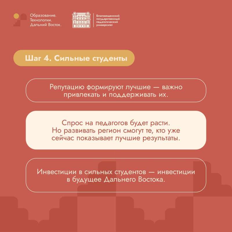Такой подход позволяет перевести педагогический вуз из статуса «поддерживающего игрока» на дальних рубежах в статус «игростроителя», который сам создаёт правила и команды для технологического развития Дальнего Востока.